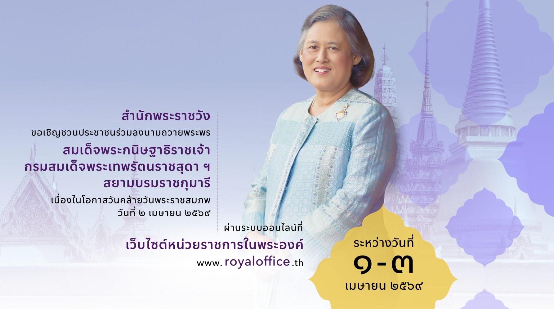 วันที่ 1 เมษายน พ.ศ. 2569 ขอเชิญชวนร่วมลงนามถวายพระพรชัยมงคล สมเด็จพระกนิษฐาธิราชเจ้า กรมสมเด็จพระเทพรัตนราชสุดาฯ สยามบรมราชกุมารี เนื่องในโอกาสวันคล้ายวันพระราชสมภพ วันที่ 2 เมษายน 2569
